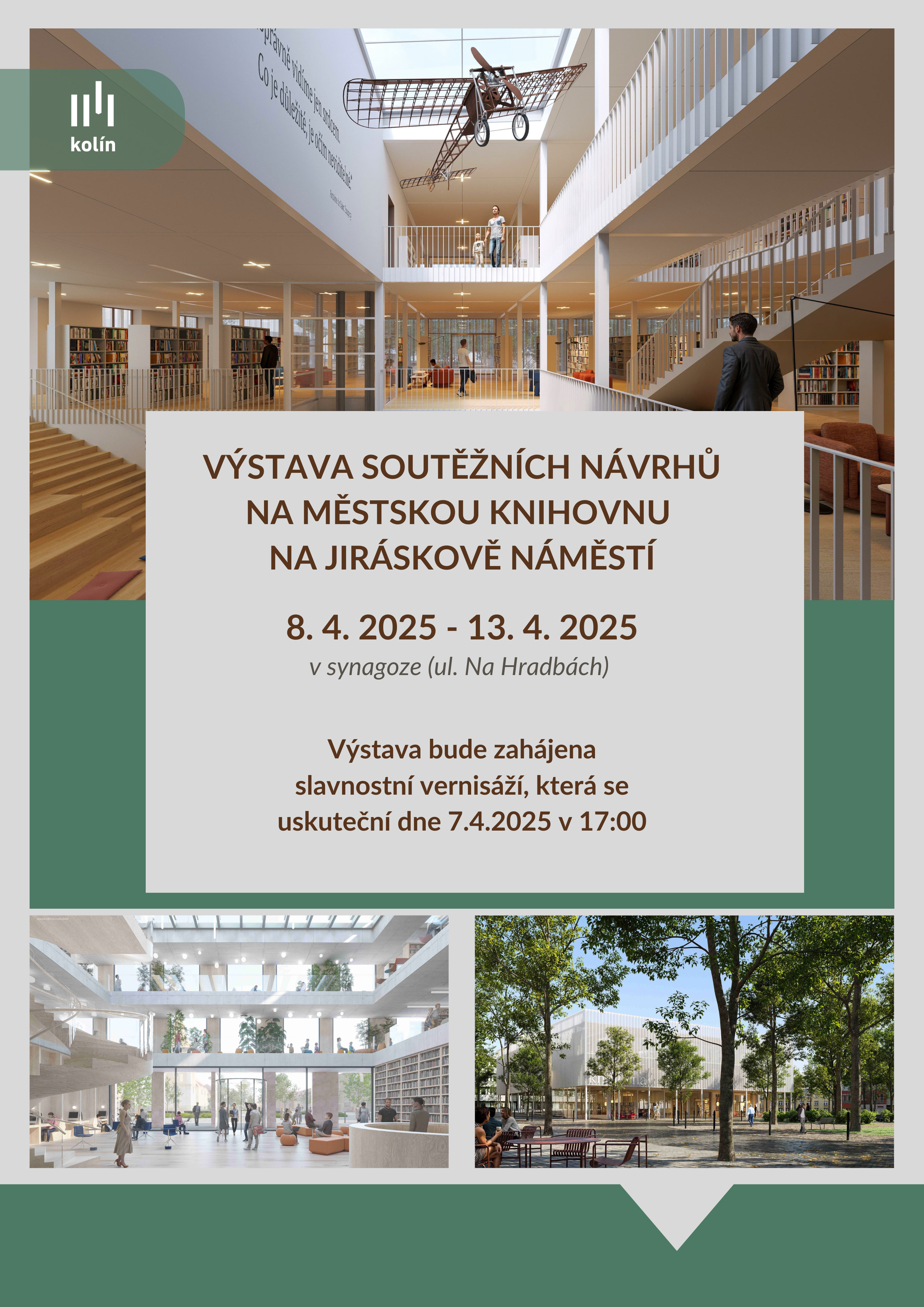 Vážení, dovolujeme si Vás tímto pozvat na výstavu soutěžních návrhů Městské knihovny v Kolíně. Po ukončení výstavy si bude možné vyzvednout soutěžní panely. S pozdravem